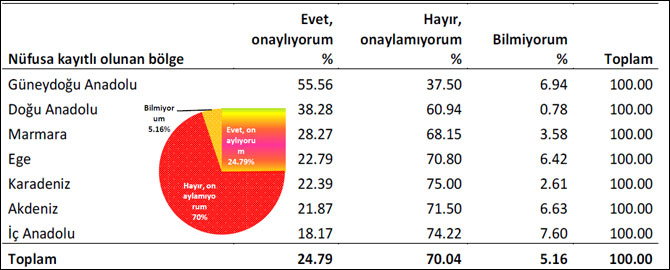 Türkiye geneli baz alındığı takdirde seçmenlerin yüzde 24.79′u müzakereleri desteklerken yüzde 70.04′ü müzakere sürecine karşı olduğunu belirtiyor. ‘Bilmiyorum’ diyenlerin oranı ise yüzde 5.16.